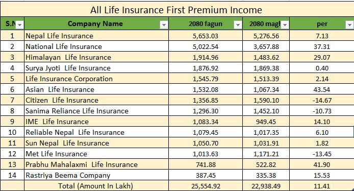 साथै, फागु महिनामा मात्र एशियन लाइफले १५ करोड ३२ लाख रुपैयाँ, सिटिजन लाइपले १३ करोड ५६ लाख रुपैयाँ, सानिमा रिलायन्स लाइफले १२ करोड ९६ लाख रुपैयाँ, आइएमई लाइफले १० करोड ८३ लाख रुपैयाँ, रिलायबलन नेपाल लाइफले १० करोड ७९ लाख रुपैयाँ, सन नेपाल लाइफले १० करोड ५० लाख रुपैयाँ, मेट लाइफले १० करोड १३ लाख रुपैयाँ, प्रभु महालक्ष्मीले ७ करोड ४१ लाख रुपैयाँ र राष्ट्रिय जीवन बीमाले ३ करोड ८७ लाख रुपैयाँ प्रथम बीमा शुल्क आर्जन गरेका हुन् ।