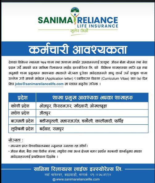 सानिमा रिलायन्स लाइफमा रोजगारीको अवसर, यसरी दिनुहोस् आवेदन