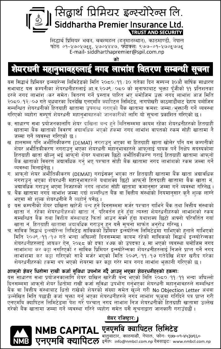 सिद्धार्थ प्रिमियरको नगद लाभांश शेयरधनीको बैंक खातामा