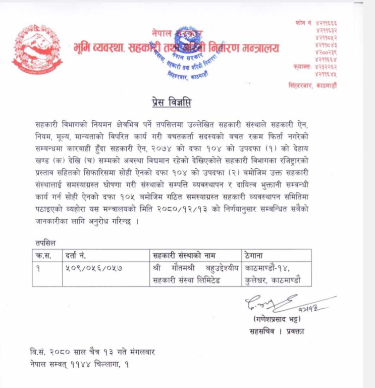सरकारले गौतमश्री बहुउद्देश्यीय सहकारी संस्थालाई समस्याग्रस्त घोषणा