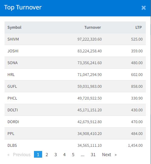 आज लगानीकर्ता शिवम र जोशि हाइड्रोपावरको शेयरमा झुम्मिएका छन् । बुधबार शिवम सिमेन्टको ९ करोड ७२ लाख रुपैयाँ र जोशि हाइड्रोपावरको ८ करोड ३२ लाख रुपैयाँको कारोबार भएको छ । त्यस्तै, सोनापुरको ७ करोड ३३ लाख रुपैयाँ र हिमालयन रिइन्स्योरेन्सको ७ करोड १० लाख रुपैयाँको कारोबार भएको छ ।