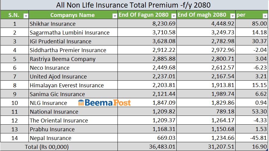 फागुन महिनामा शिखर इन्स्योरेन्सले ८५ प्रतिशतले बढेर ८२ करोड ३० लाख रुपैयाँ, सगरमाथा लुम्बिनीले १४.१८ प्रतिशतले बढेर ३७ करोड १० लाख रुपैयाँ, आइजीआई प्रुडेन्सियलले ३०.३७ प्रतिशतले बढेर ३६ करोड २८ लाख रुपैयाँ, राष्ट्रिय बीमा कम्पनीले ३.०४ प्रतिशतले बढेर २८ करोड ८५ लाख रुपैयाँ र युनाइटेड इन्स्योन्सले ३.२१ प्रतिशतले बढेर २२ करोड ३७ लाख रुपैयाँको व्यवसाय गर्न सफल भएका छन् ।