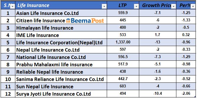 पछिल्लो समय कारोबारले समेत लय लिन सकेको छैन । बीमा कम्पनीको शेयर मूल्य पनि आज ओरालो लागेको छ । नेप्सेमा सूचीकृत २४ बीमा कम्पनी मध्य १९ कम्पनीको शेयर मूल्य घटेको छ भने ४ कम्पनीको वृद्धि हुँदा एक कम्पनीको स्थिर अवस्थामा रहेको छ ।