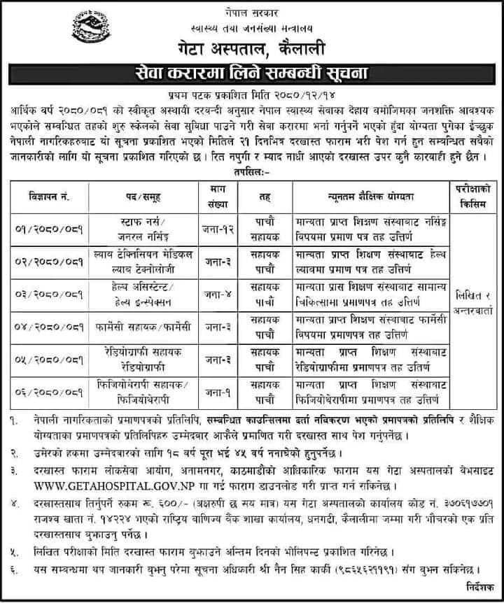 काठमाडौँ । गेटा अस्पतालले विभिन्न पदका लागि कर्मचारी माग गरेको छ । अस्पतालले एक सूचना जारी गर्दै करार पदका लागि २६ हजार कर्मचारी माग गरेको हो ।
