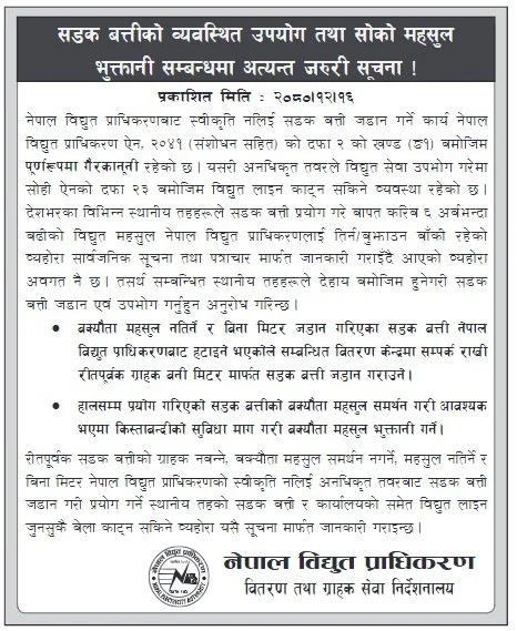 साथै प्राधिकरणले अनधिकृत तवरले विद्युत् सेवा उपभोग गरेको पाइएमा ऐनको बमोजिम विद्युत् लाइन काट्न चेतावनी समेत दिएको छ । प्राधिकरणको वितरण केन्द्रमा सम्पर्क गरेर मात्र सडक बत्ती जडान गर्न पनि प्राधिकरणले सुसूचित गराएको छ ।