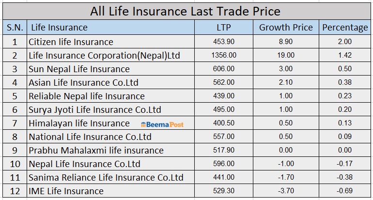नेप्सेमा कारोबार भइरहेका १३ जीवन बीमा कम्पनी मध्ये कम्पनीको शेयर मूल्य बढेको छ । जीवन बीमा कम्पनीको शेयर २९ दशमलव ३० अकंले बढेर १०२१९ को बिन्दुमा बन्द भएको हो । बिहीबार सिटिजन लाइफको शेयरमूल्य २ प्रतिशतले सबैभन्दा बढी रुपैयाँले बढेको छ । बिहीबार सूर्यज्योति लाइफका लगानीकर्ताहरुले सर्वाधिक गुमाएका छन् ।