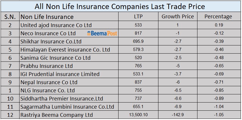 निर्जीवन बीमा कम्पनीको शेयर ६९.८१ अकंले घटेर १०४५२ को बिन्दुमा बन्द भएको छ । बिहीबार कारोबार भएका निर्जीवन बीमा कम्पनीहरुमध्ये १ वटाको मात्र बढेको छ । बिहीबार कारोबार भएका कम्पनीहरुमध्ये युनाइटेड अजोड इन्स्योरेन्सको मात्र शेयरमूल्य बढेको छ ।