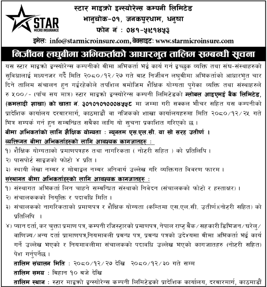 तालिम चैत्र २७ गतेदेखि ३० गतेसम्म बिहान १० बजेदेखि संचालन गरिने कम्पनीले बताएको छ । तालिम संचालन कम्पनीको प्रादेशिक कार्यालय, दरबारमार्ग, काठमाडौंमा हुनेछ ।