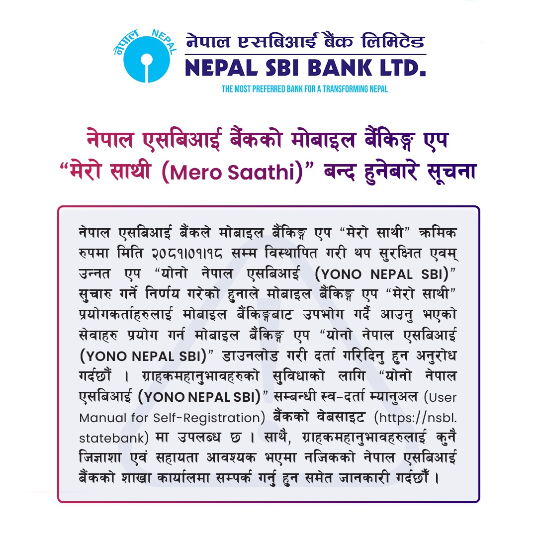 साथै, मेरो साथी एपबाट उपभोग गर्दै आएका सेवाहरु अब योनो नेपाल एसबिआई एपबाट प्रदान गरिने भएकाले सेवाग्राहीलाई उक्त एप डाउनलोड गरी दर्ता गर्न बैंकले आग्रह गरेको छ ।