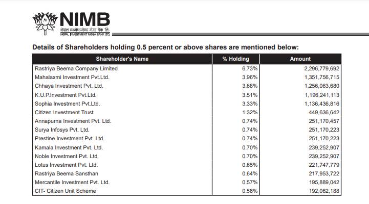 प्रेस्टिन इन्भेष्टमेन्टको ०.७४ प्रतिशत, कमला इन्भेष्टमेन्टको ०.७० प्रतिशत, नोबल इन्भेष्टमेन्टको ०.७० प्रतिशत, लोटस इन्भेष्टमेन्टको ०.६५ प्रतिशत, राष्ट्रिय बीमा संस्थानको ०.६४ प्रतिशत, मर्कन्टाइल इन्भेष्टमेन्टको ०.५७ प्रतिशत र सिआइटी–सिटिजन युनिट स्किमको ०.५६ प्रतिशत होल्डिङ छ ।