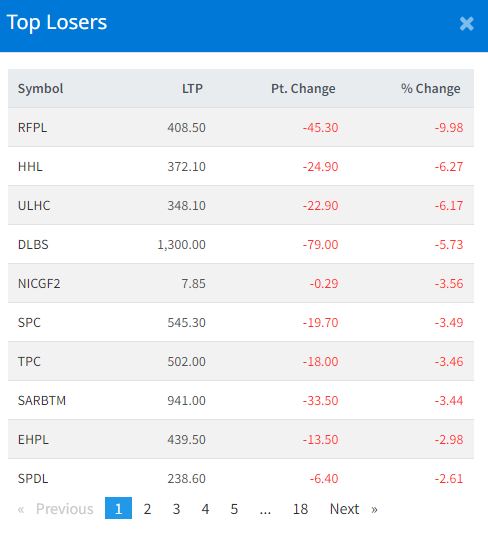 नेपाल स्टक एक्सचेञ्ज (नेप्से) ६.२६ अकंले घटेर २०१२.०७ बिन्दुमा बन्द भएको छ । सोमबार ३१५ कम्पनीको ७२ लाख ९० हजार २०० कित्ता शेयर किनबेच हुँदा २ अर्ब ८७ करोड ४७ लाख रुपैयाँको कारोबार भएको छ ।