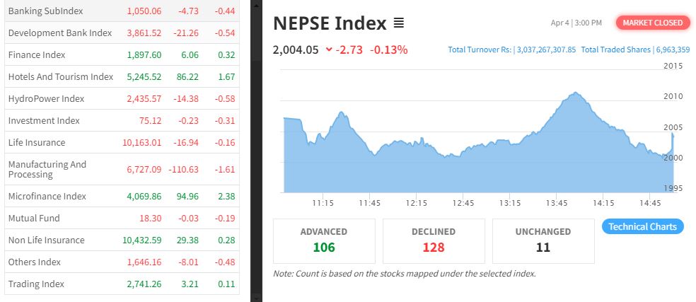 नेपाल स्टक एक्सचेञ्ज (नेप्से) २.७३ अकंले घटेर २००४.०५ बिन्दुमा बन्द भएको छ । साताको अन्तिम कारोबारको दिन ३०२ कम्पनीको ६९ लाख ६३ हजार ३५९ कित्ता शेयर किनबेच हुँदा ३ अर्ब ३ करोड ७२ लाख ६७ हजार रुपैयाँको शेयर खरिद बिक्री भएको हो ।