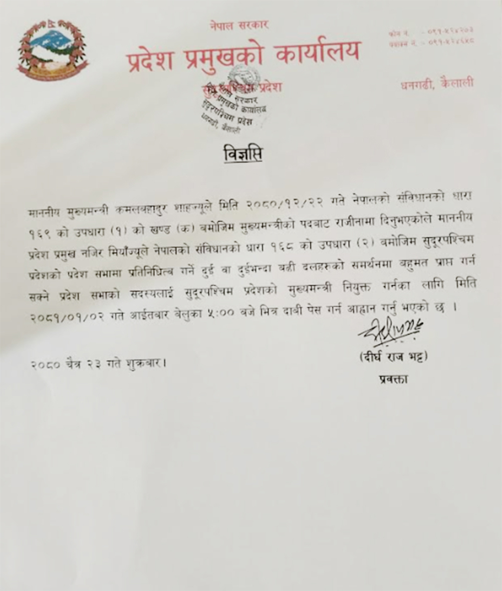 सुदूरपश्चिममा १० दिनभित्र मुख्यमन्त्रीको दाबी पेस गर्न प्रदेश प्रमुखको आह्वान
