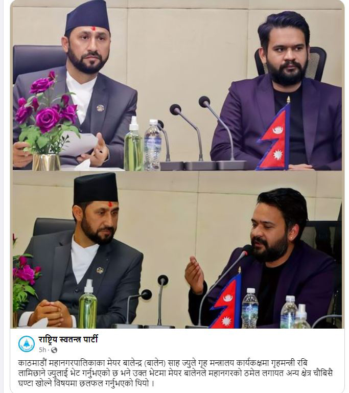 काठमाडौं । आफ्नै पत्नी सहकारी ठगि काण्डमा मुछिएपछि उपप्रधान तथा गृहमन्त्री रवि लामिछानेले काठमाडौं महानगरपालिकाका मेयर बालेन साहलाई हारगुहार गरेका छन् । हालसम्म बालेनलाई भेट्न कुनै वास्ता नगरेका गृहमन्त्री लामिछानेले बुधबार महानगरको सहकारी विभागले ‘रवि पत्नी’ निकिता पौडेल उपाध्यक्ष रहेको साई स्वागत बचत तथा ऋण सहकारी संस्थामा छापा मारेर सफ्टवेयर तथा कागजात जफत गरेकै भोलिपल्ट मेयर बालेनलाई आफ्नै कार्यकक्षमा भेटेर हारगुहार गरेका हुन् ।