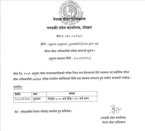 नेपाल बीमा प्राधिकरणको गण्डकी प्रदेश कार्यालय, पोखराले आज (चैत्र २५ गते) एक सूचना जारी गर्दै २८ गते बुधबार परीक्षा हुने जनाएको हो । अनलाइन माध्यमबाट हुने उक्त परीक्षा दिउँसो चार बजेदेखि साढे पाँच बजेसम्म सञ्चालन हुनेछ । परीक्षामा देशभरका परीक्षार्थीहरु समावेश हुन पाउनेछन् ।