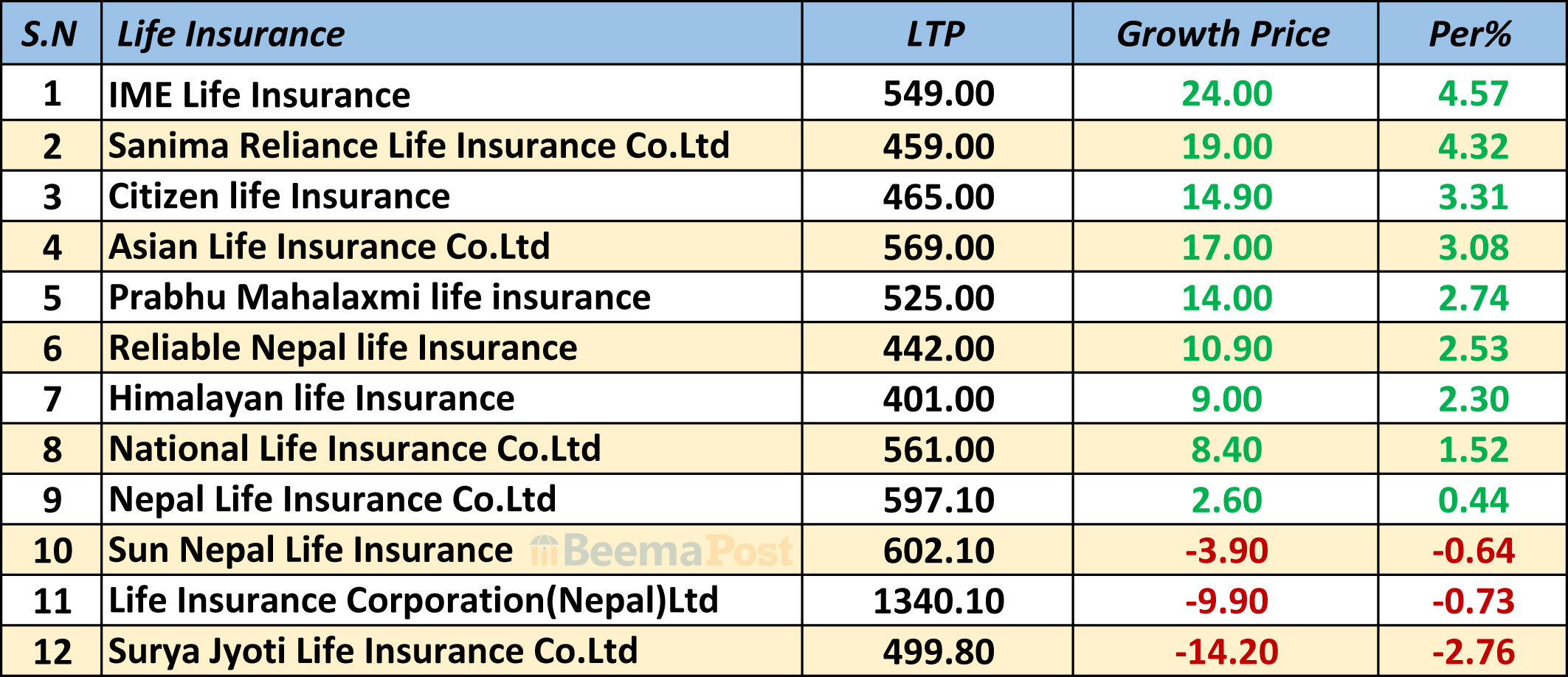 त्यसदिन आइएमई लाइफको शेयरमूल्य सर्वाधिक ४.५७ प्रतिशतले बढेको छ । दोस्रोमा सानिमा रिलायन्सको ४.३२, तेस्रोमा सिटिजन लाइफको ३.३१ र चौथोमा एशियन लाइफको ३.०८ प्रतिशतले शेयरमूल्य बढेको छ । यता, सूर्यज्योति लाइफको भने सर्वाधिक २.७६ प्रतिशतले शेयरमूल्य घटेको छ ।