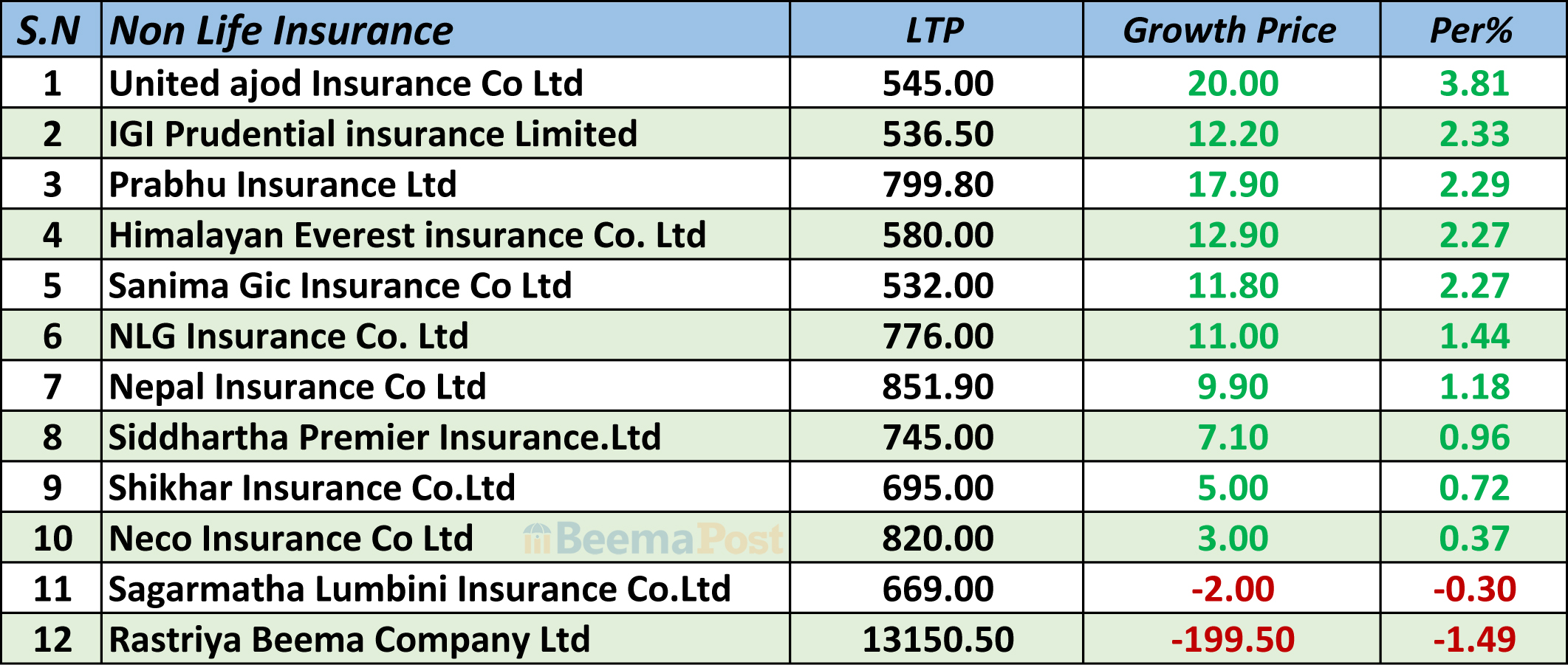 निर्जीवन बीमा कम्पनीहरुको शेयरमूल्य पाँच सय रुपैयाँमाथि रहेको छ । सानिमा जिआईसीको ५३२, आईजीआई प्रुडेन्सियलको ५३६.५०, यूनाइटेड अजोडको ५४५ तथा हिमालयन एभरेष्टको ५८० रुपैयाँ रहेको छ ।