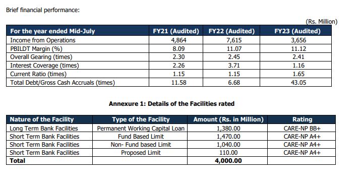 कम्पनीले सन् २०२१ मा ४ अर्ब ८६ करोड रुपैयाँ व्यापार गरेको थियो । ।यसले ४ अर्ब बैंक कर्जाका लागि रेटिङ गराएको छ । जसमध्ये, लङ ट्रम १ अर्ब ३८ करोड बैंक कर्जाका लागि ‘केयर एनपी बीबीप्लस’ र सर्ट ट्रम २ अर्ब ६२ करोड रुपैयाँ बैंक कर्जाका लागि ‘केयर एनपी ए४ प्लस’ रेटिङ प्राप्त गरेको छ ।