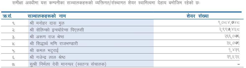 सभाले पारित गरेको प्रतिवेदन अनुसार कम्पनीका अध्यक्ष मनोहर दास मुलको स्वामित्वमा १० लाख ८४ हजार कित्ता शेयर रहेको छ । त्यस्तै, सेलिन्को इन्स्योरेन्स पिएलसीको स्वामित्वमा २९ लाख ९७ हजार कित्ता रहेको छ ।
