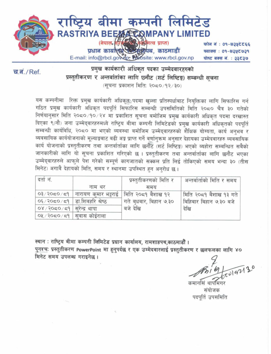 राष्ट्रिय बीमा कम्पनीको सीईओको लागि ४ जनाको नाम सर्टलिस्टेड, अन्तर्वार्ता कहिले ?