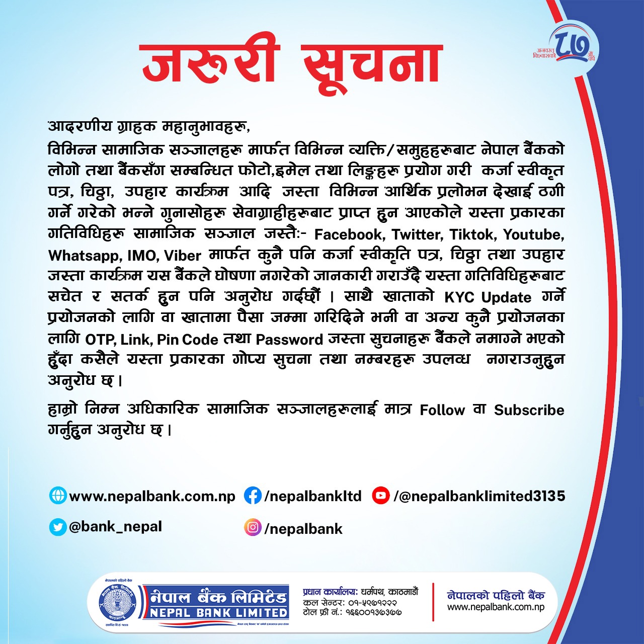 सामाजिक सञ्जाल फेसबुक, ट्विटर, टिकटक, युट्युव, ह्वाट्सएप, ईमो तथा भाइबर मार्फत बैंकले कुनै पनि कर्जा स्वीकृत पत्र, चिठ्ठा तथा उपहार जस्ता कार्यक्रम घोषणा नगरेको बैंकले जनाएको छ ।