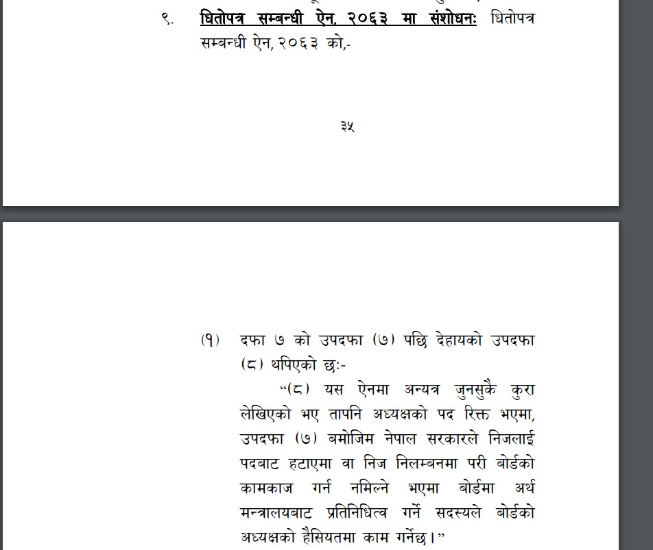 यही चैत ३० गते राष्ट्रपति कार्यालयबाट स्वीकृत भएको विधेयकको धितोपत्र सम्बन्धी ऐन २०६३ को दफा नं ८ संशोधन गर्दै ‘यस ऐनमा अन्यत्र जेसुकै कुरा लेखिएको भएपनि अध्यक्षको पद रिक्त भएमा, उपदफा (७) बमोजिम नेपाल सरकारले निजलाई पदबाट हटाएमा वा निज निलम्वनमा परी बोर्डको अध्यक्षको कामकाज गर्न नमिल्ने भएमा बोर्डमा अर्थमन्त्रालयबाट प्रतिनिधित्व गर्ने सदस्यले बोर्डको अध्यक्षको हैसियतमा काम गर्नेछ’ भन्ने व्यवस्था थप गरिएको छ । सो थप गरिएको व्यवस्थाले यही चैत्र ३० गतेदेखि मान्यता प्राप्त गरेपछि अब बोर्ड अध्यक्षको जिम्मेवारी रितेश शाक्यको काँधमा आइपरेको छ ।
