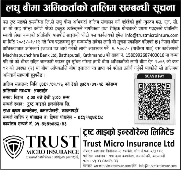 काठमाडौं । ट्रस्ट माइक्रो इन्स्योरेन्स लिमिटेडले लघु बीमा अभिकर्ताको तीन दिने तालिम संचालन गर्ने भएको छ । कम्पनीमा आवद्ध भइ काम गर्न इच्छुक व्यक्तिको सुविधालाई मध्यनजर गर्दै कम्पनीले तालिम संचालन गर्न लागको हो।
