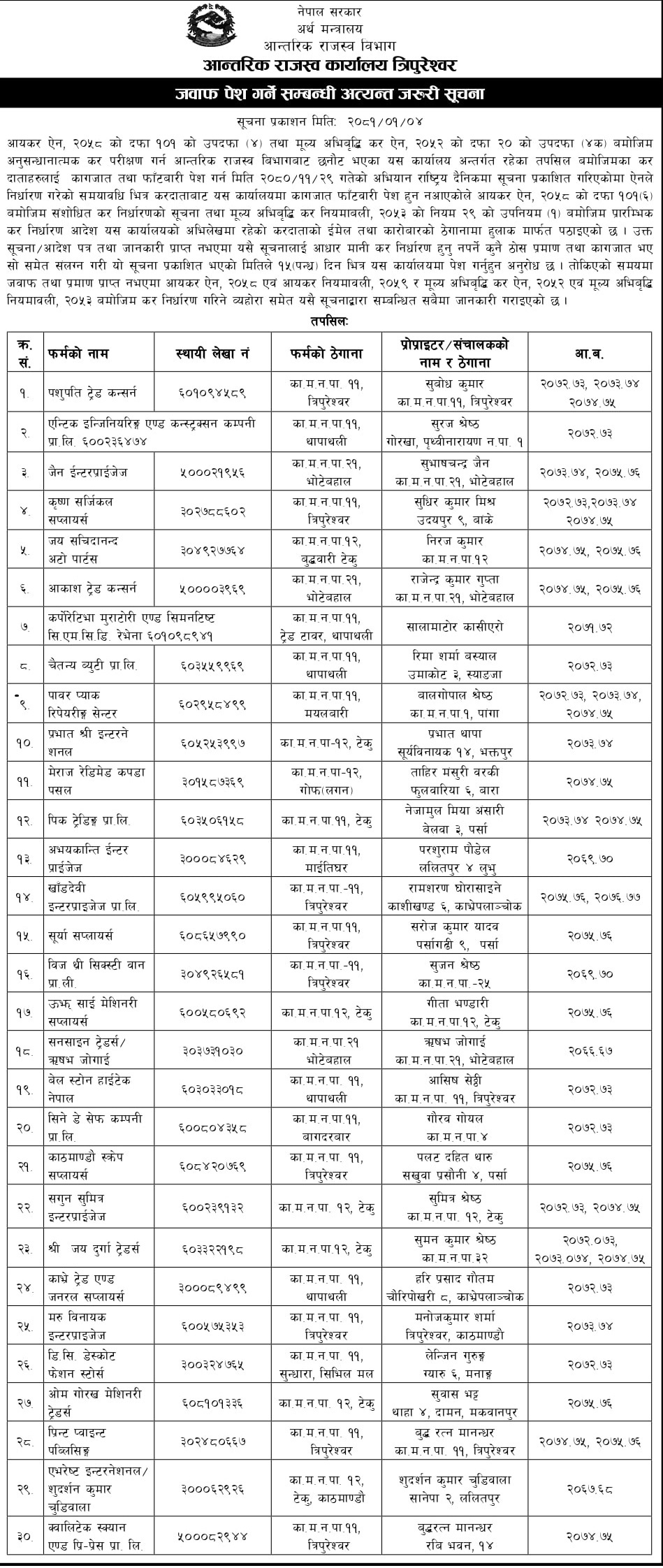कार्यालयले आयकर ऐन, २०५८ को दफा १०१ को उपदफा ४ मा तथा मूल्य अभिबृद्धि कर ऐन, २०५२ को दफा २० को उपदफा (४क) बमोजिम ३० कम्पनीहरुलाई कर निर्धारण हुनु नपर्ने कुनै ठोस प्रमाण तथा कागजात भए १५ दिन भित्र संकलन गर्ने भनेको हो ।