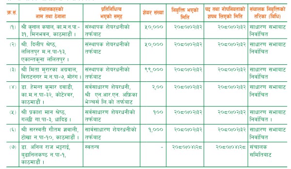 कम्पनीमा संस्थापक शेयरधनी मिता मुरारका अग्रवालको ९९ हजार कित्ता, हेमन्त कुमार दवाडीको २ सय कित्ता, प्रकाश मान श्रेष्ठको १ सय कित्ता, सरस्वति गौतम ज्ञवालीको १ हजार कित्ता र अनिल राज भट्टराईको नाममा रहेको शेयर स्वामित्व खुलाएको छैन् ।