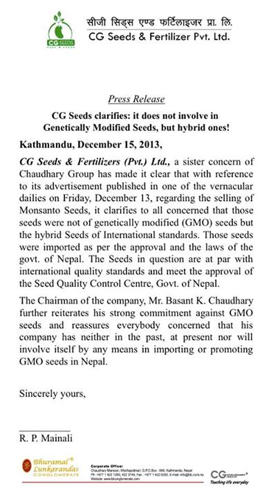 सन् २०१३ डिसेम्बर १५ मा सीजी सिड्सका तत्कालीन अध्यक्ष वसन्त चौधरीलाई उदृत गर्दै जारी भएको विज्ञप्तिमा नेपाल सरकारको कानून बमोजिम बीउ गुणस्तर निर्धारण केन्द्रको अनुमति लिएरै मोन्सान्टोको अन्तर्राष्ट्रिय गुणस्तरको बीउ आयात गर्न लागेको भनी लेखिएको थियो ।