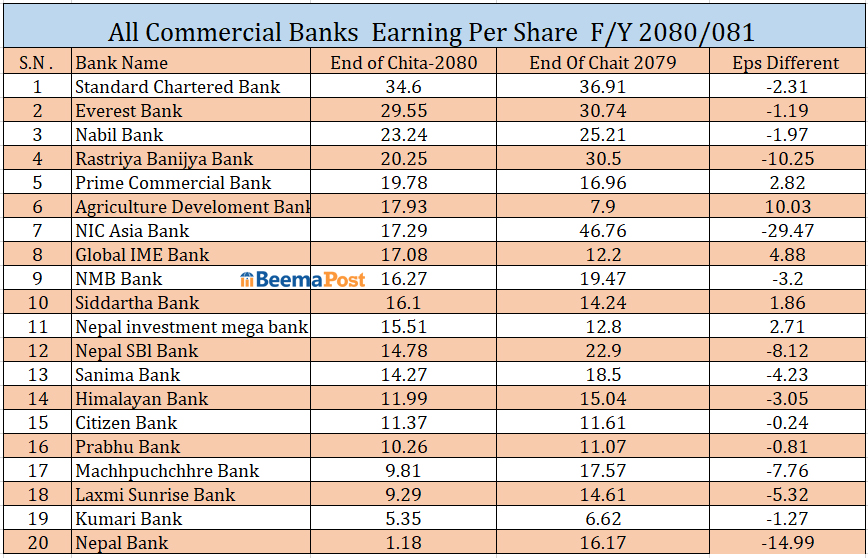बैंकहरुको ईपीएसमा रमाइलो तथ्य, प्रतिशेयर १ देखि ३४ रुपैयाँसम्म (सूचीसहित)