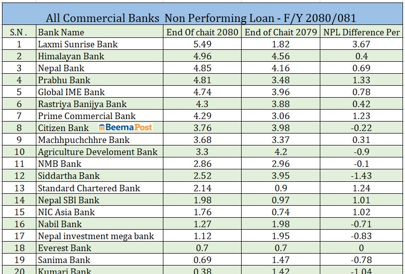 लक्ष्मी सनराईज बैंकको खराब कर्जाको सिमा नाघ्यो, सात बैंकको ४ प्रतिशतमाथि, अन्यको अवस्था कस्तो ?