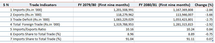 यता, नेपालको वैदेशिक व्यापार घाटा भने १० खर्ब ५३ अर्ब ४२ करोड ३८ लाख रुपैयाँ रहेको छ । जुन गत वर्षको सोहि तुलनामा २.९२ प्रतिशत कमी हो ।