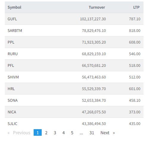 त्यस्तै, सर्वोत्तम सिमेन्टस, पिपुल्स पावर, रुरु जलविधुत्, शिवम सिमेन्टस, हिमालयन रि, सोनापुर मिल्स, एनआईसी एशिया बैंक र सूर्यज्योति लाइफको सर्वाधिक कारोबार भएको छ।