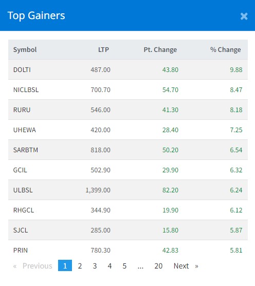 शेयर बजार बढेसँगै दोल्ती पावर लिमिटेडको ९ दशमलव ८८ प्रतिशत र एनआइसी एशिया लघुवित्तको ८.४७ प्रतिशतले शेयरमूल्य सर्वाधिक बढेको छ ।