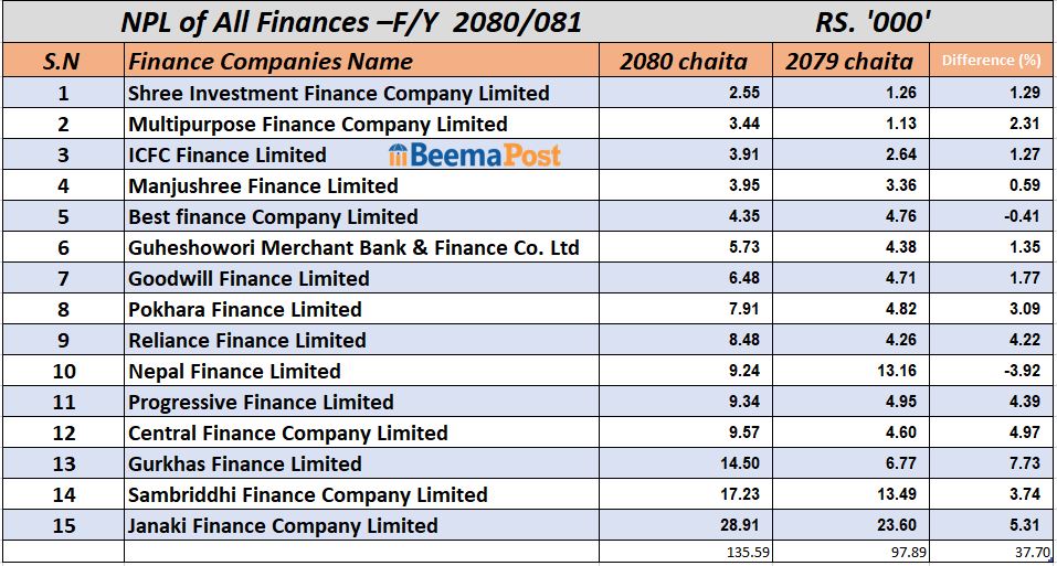 फाइनान्स कम्पनीको खराब कर्जा निकै उचाइमा पुगेको छ । यस अवधिमा नेपाल फाइनान्स र बेष्ट फाइनान्सले मात्र खराब कर्जा घटाउन सफल भएका हुन् । नेपालको ०.४१ प्रतिशतले घटेर ४.३५ प्रतिशत र बेष्टको ३.९३ प्रतिशतले घटेर ९.२४ प्रतिशत पुगेको छ ।