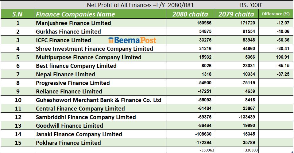 त्यस्तै, चैत मसान्तसम्मको तथ्याङ्ग हेर्दा नाफा गोर्खाज फाइनान्सको ४० प्रतिशतले घटेर ५ करोड ४८ लाख रुपैयाँ, आइसिएफसि फाइनान्सको ६० प्रतिशतले घटेर ३ करोड ३२ लाख रुपैयाँ, श्रीइन्भेष्टमेन्ट फाइनान्सको ३० प्रतिशतले घटेर ३ करोड १२ लाख रुपैयाँ, बेष्ट फाइनान्सको ६५ प्रतिशतले घटेर ८० लाख २६ हजार रुपैयाँ र नेपाल फाइनान्सको ८७ प्रतिशतले घटेर १३ लाख १८ हजार रुपैयाँमा सीमित भएको छ ।