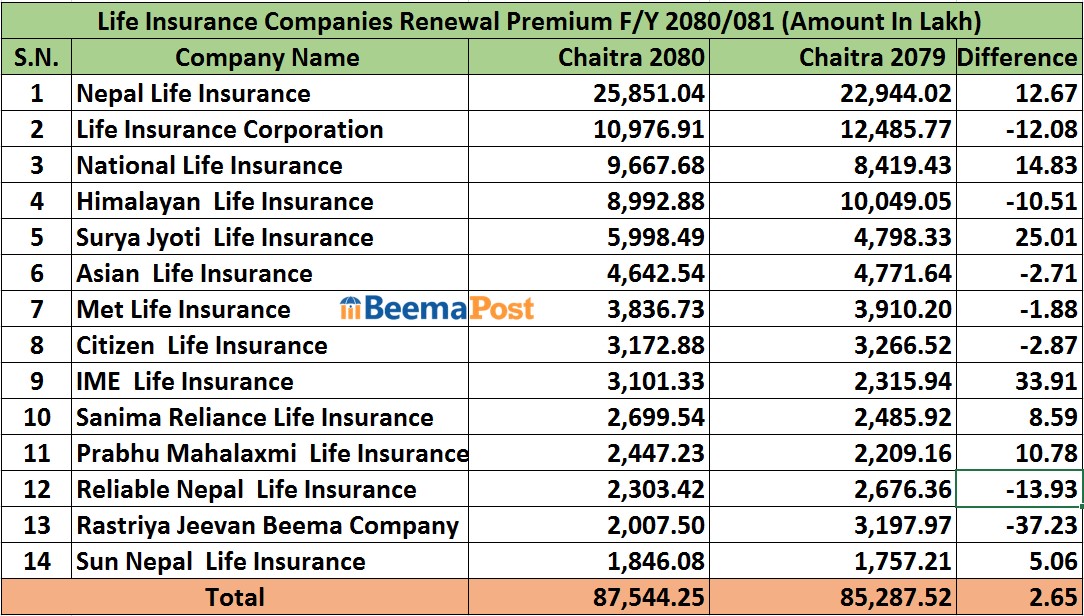 चालु आवको चैत्र महिनामा हिमालयन लाइफले ८९ करोड ९२ लाख रुपैयाँ, सूर्यज्योति लाइफले ५९ करोड ९८ लाख रुपैयाँ, एशियन लाइफले ४६ करोड ४२ लाख रुपैयाँ र मेट लाइफले ३८ करोड ३६ लाख रुपैयाँ नवीकरणबीमा शुल्क आर्जन गरेका छन् ।