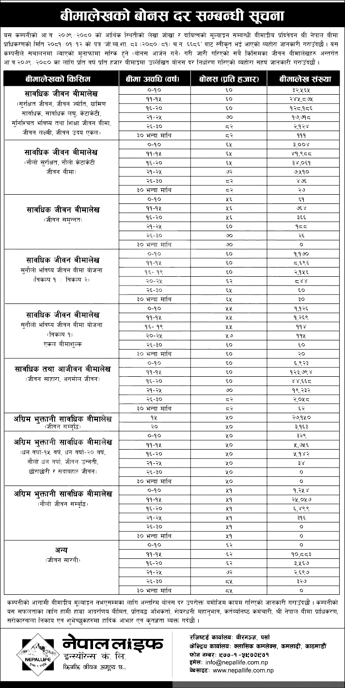 त्यसैगरी, कम्पनीले सावधिक जीवन बीमालेख अन्तर्गतकै नौलो सुरक्षित र नौलो केटाकेटी जीवन बीमा योजनामा बीमा अवधिअनुसार न्यूनतम ६५ रुपैयाँदेखि अधिकतम ८२ रुपैयाँसम्म प्रतिहजारका दरले बोनस दिने भएको छ । सोही बीमालेखको जीवन समुन्नत बीमा योजनामा कम्पनीले बीमितलाई न्यूनतम ५६ रुपैयाँदेखि अधिकतम ७० रुपैयाँसम्म बोनस दिने घोषणा गरेको छ ।