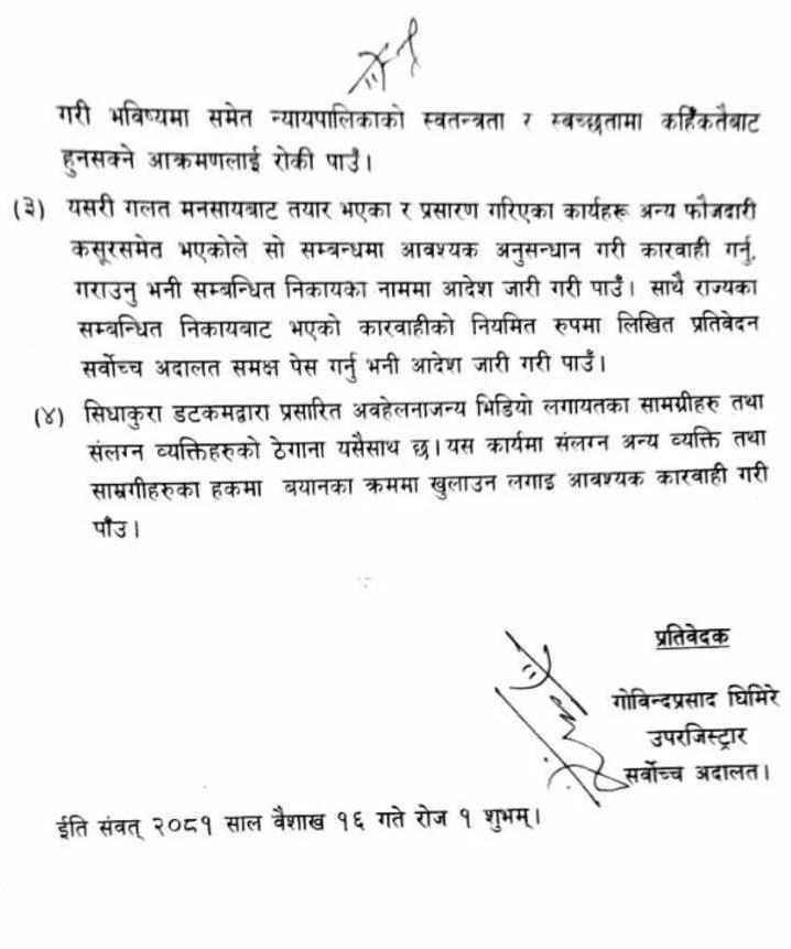 सर्वोच्चमा दायर प्रतिवेदनमा अदालतको अवहेलनामा हदैसम्मको सजायको माग गरिएको छ भने युट्यब लगायत सामाजिक सञ्चालबाट समाचार सामग्री तत्काल हटाउनुपर्ने र समाचार सामग्री तयार पार्ने तथा प्रसारण गर्ने व्यक्तिलाई अदालतमा झिकाई बयान गराएर आवश्यक कानूनी कारबाहीको माग गरिएको छ । सर्वोच्चले यसलाई न्यायपालिकामाथिको आक्रमण समेत भनेको छ ।