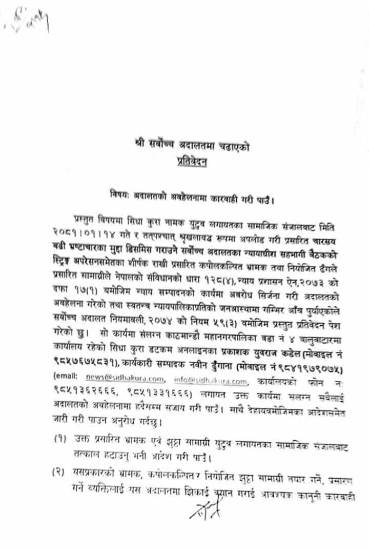काठमाडौं । सीधाकुरा डटकम तथा युट्युब च्यानलसहित प्रकाशक र सम्पादकविरुद्ध सर्वोच्च अदालतमा अवहेलना मुद्दा दर्ता भएको छ । सर्वोच्चका सहायक प्रवक्ता तथा उपरजिस्ट्रार गोविन्दप्रसाद घिमिरेले अदालतमा अवहेलना मुद्दा दर्ता गरेका हुन् ।