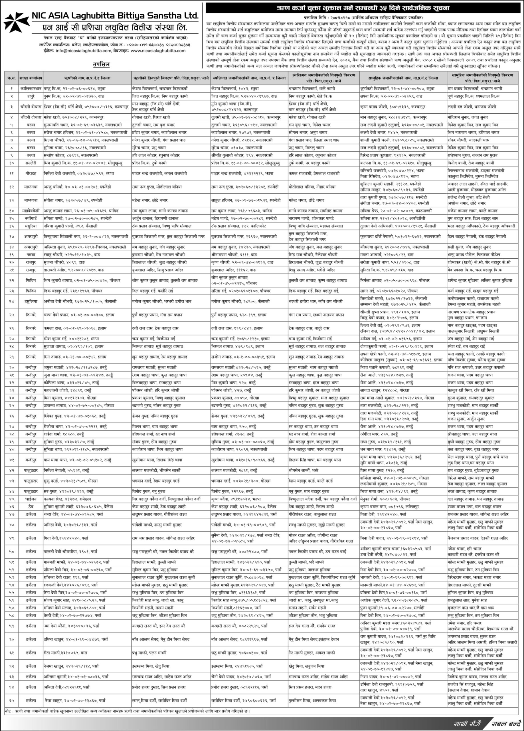 कम्पनीको शाखा कार्यालय कालिकास्थान, हापुरे, चाँदनी दोधारा, बरुवा, सल्लेरी, माझगवा, महादेवबेशी, नयाँगाउँ, मसुरिया, अपरापुरी, गढवा, राजपुर, फिदिम, हसुलिया, तिनघरे, बन्दीपुर, पालुङटार, धाईजन, ठैव र डकैलाबाट कर्जा लिएका विभिन्न ६५ ऋणीलाई ३५ दिनभित्र कर्जा चुक्ता गर्न भनेको हो ।