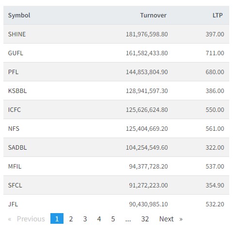 त्यस्तै, गुर्खाज फाइनान्स, पोखरा फाइनान्स, कामना सेवा विकास बैंक, आइसीएफसी फाइनान्स, नेपाल फाइनान्स, सांग्रिला डेभलपमेन्ट बैंक, मञ्जुश्री फाइनान्स, समृद्धि फाइनान्स र जानकी फाइनान्सको सर्वाधिक कारोबार भएको छ।