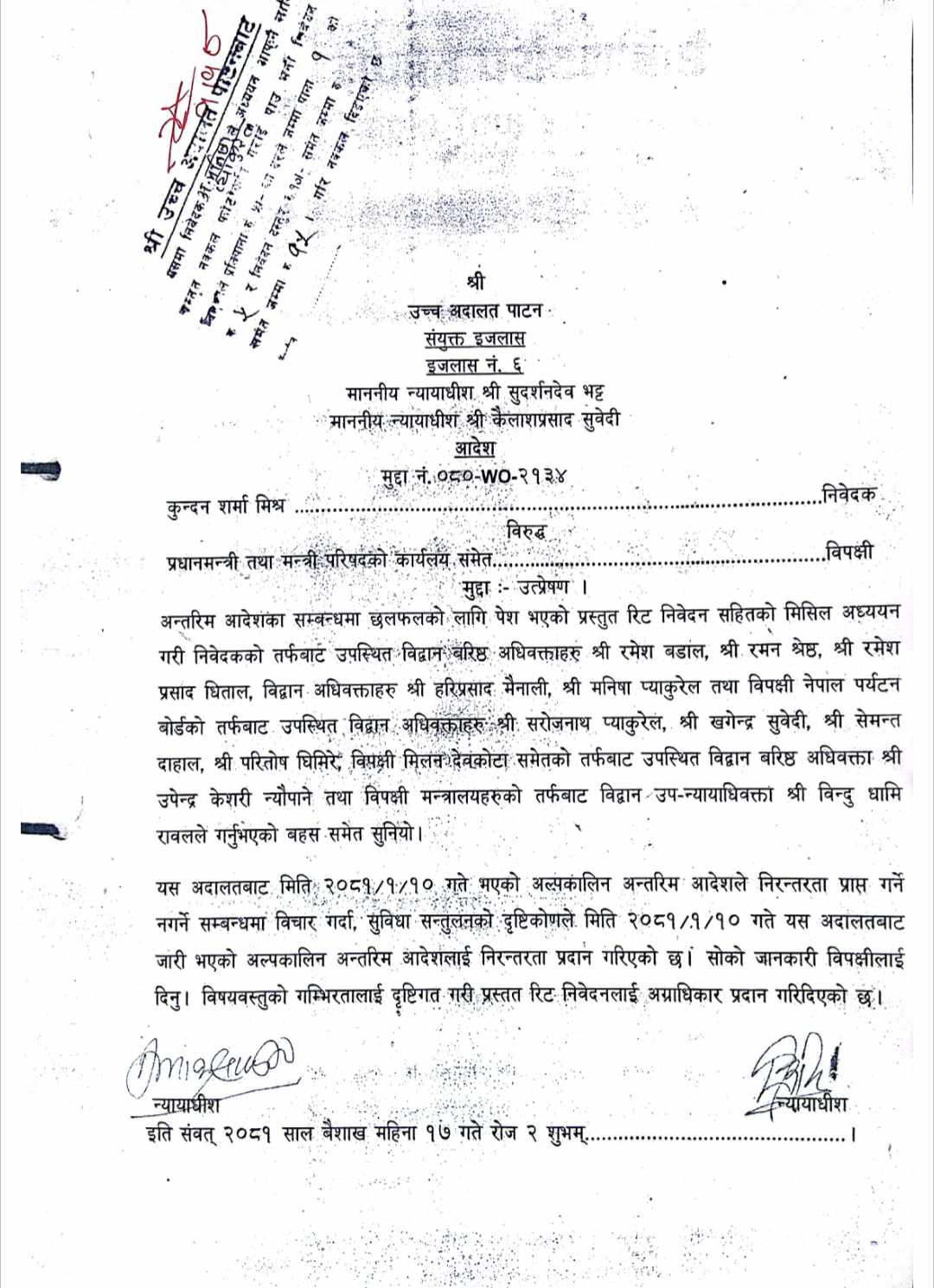 पर्यटन बोर्डका कर्मचारी युनियनका अध्यक्ष कुन्दन शर्मा मिश्रसहितका ११ जना कर्मचारीले वैशाख ९ गते दर्ता गरेको रिट निवेदनमा १० गते उच्च अदालत पाटनले अल्पकालीन अन्तरिम आदेश दिएको थियो । उच्च अदालतको यो आदेशसँगै मुद्दाको टुंगो नलागेसम्म पर्यटन बोर्ड सीईओ छनोट उपसमितिले कुनै काम कारबाही गर्न पाउने छैन ।