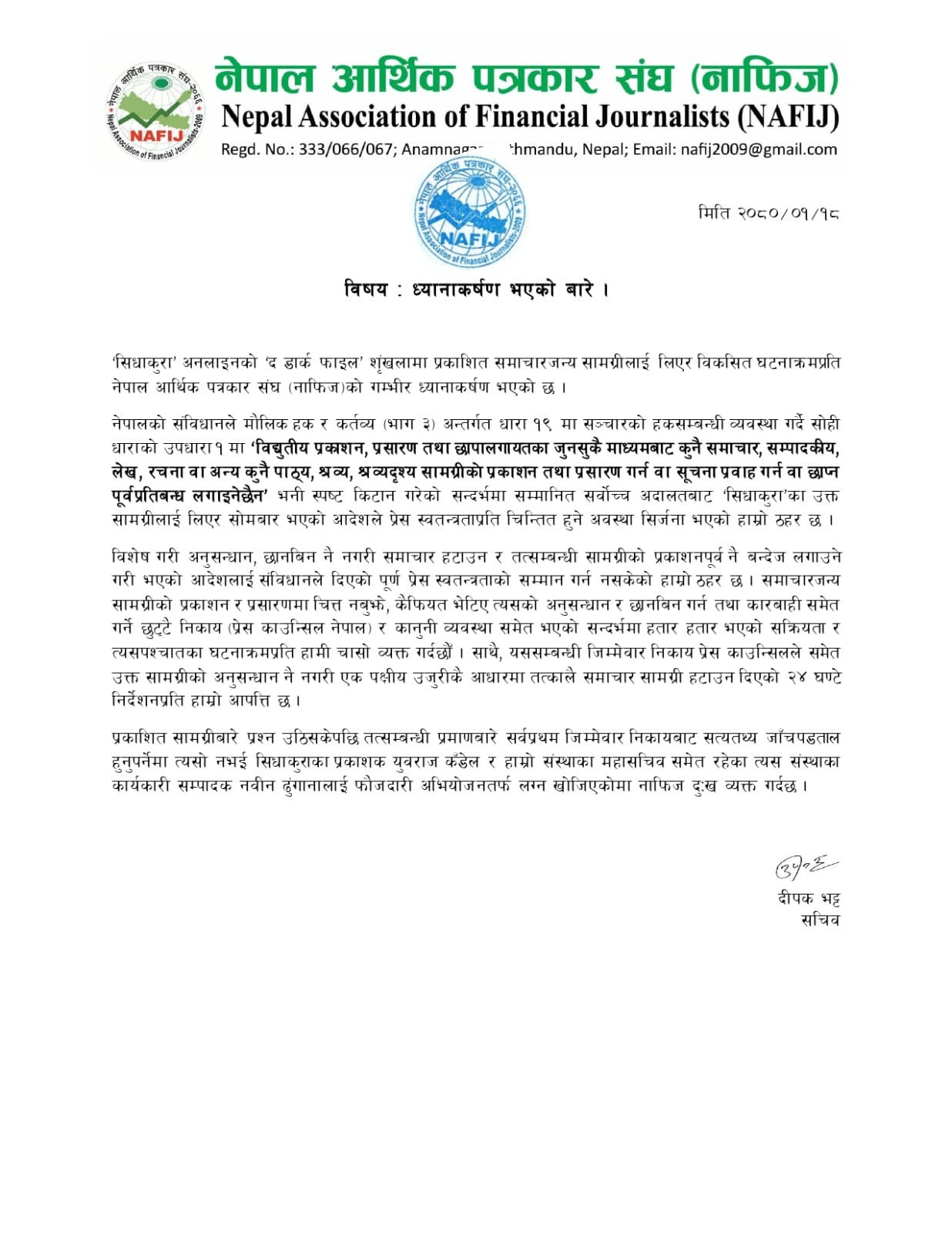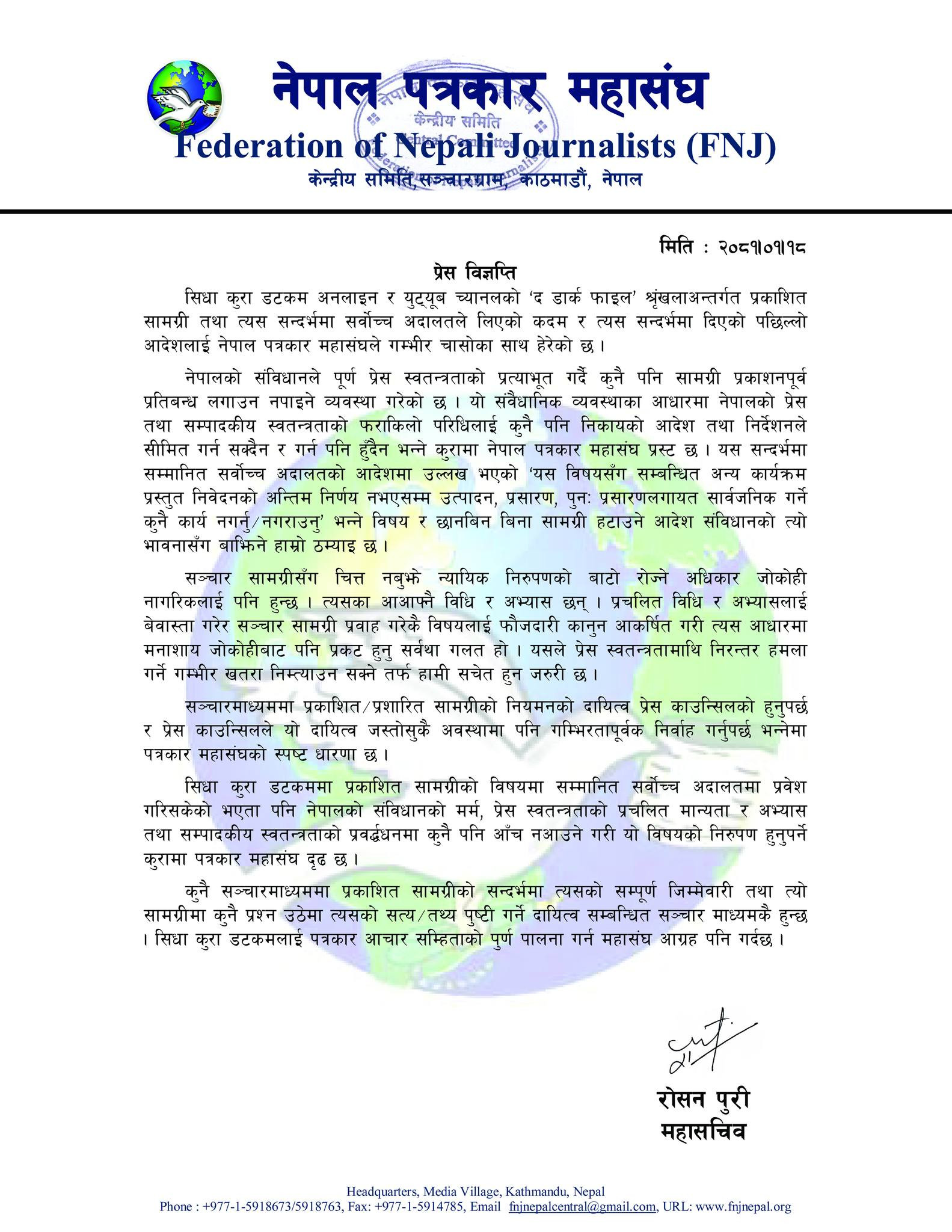 सर्वोच्च अदालतद्धारा संविधान कुल्चदै प्रेस स्वतन्त्रतामाथि धावा बोल्ने दुस्प्रयास, महासंघ र अन्य संस्थाको प्रतिवाद
