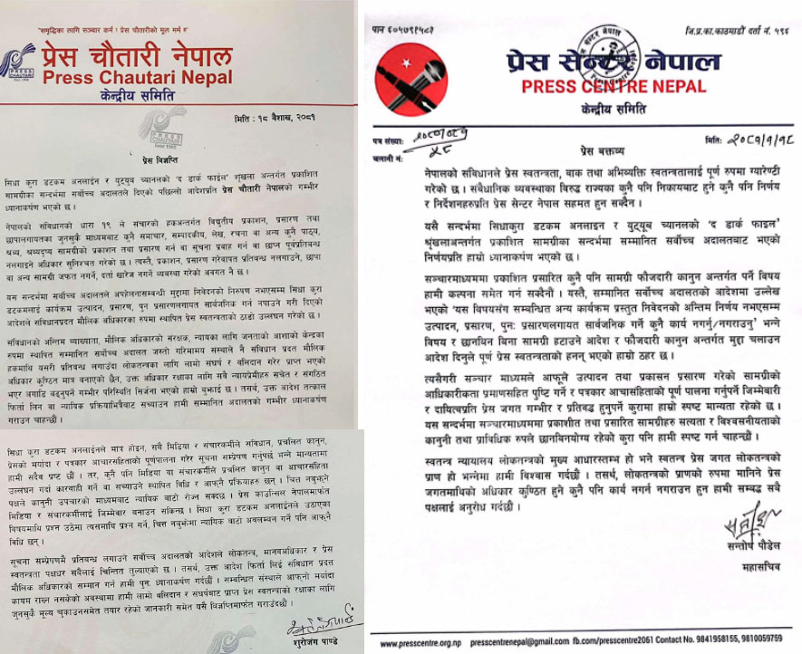 त्यसैगरी, प्रेस चौतारी नेपालका महासचिव सुरोजंग पाण्डेले आज बिज्ञप्ति जारी गर्दै नेपालको संविधानको धारा १९ मा रहेको प्रेस स्वतन्त्रता सम्बन्धी व्यवस्था बिपरित हुने गरी भएको आदेशले प्रेस स्वतन्त्रताको ठाडो उल्लंघन गरेको स्पष्ट पार्दै प्रेस स्वतन्त्रता रक्षाको लागि जस्तोसुकै मूल्य चुकाउन तयार रहेको जनाइएको छ ।