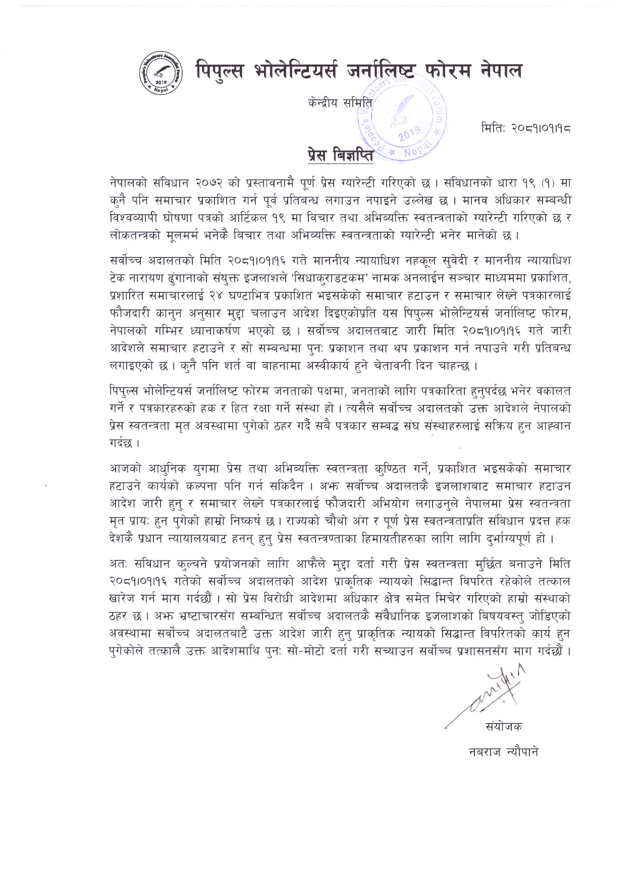 त्यसैगरी, पिपुल्स भोलेन्टियर्स जर्नालिष्ट फोरमले पनि आजै प्रेस बिज्ञप्ति जारी गर्दै सर्वोच्च अदालतले नेपालको संविधान कुल्चिएर प्रेस स्वतन्त्रतामाथि अतिक्रमण गरेको ठहर गर्दै उक्त आदेश जसरी जारी भएको हो, त्यसैगरी, सच्याउन संयोजक नबराज न्यौपानेद्धारा जारी बिज्ञप्तिमार्फत माग गरिएको छ । फोरमले प्रेस स्वतन्त्रतामाथिको प्रहारमा सबै पक्षलाई एकजुट हुन पनि आह्वान गरेको छ ।