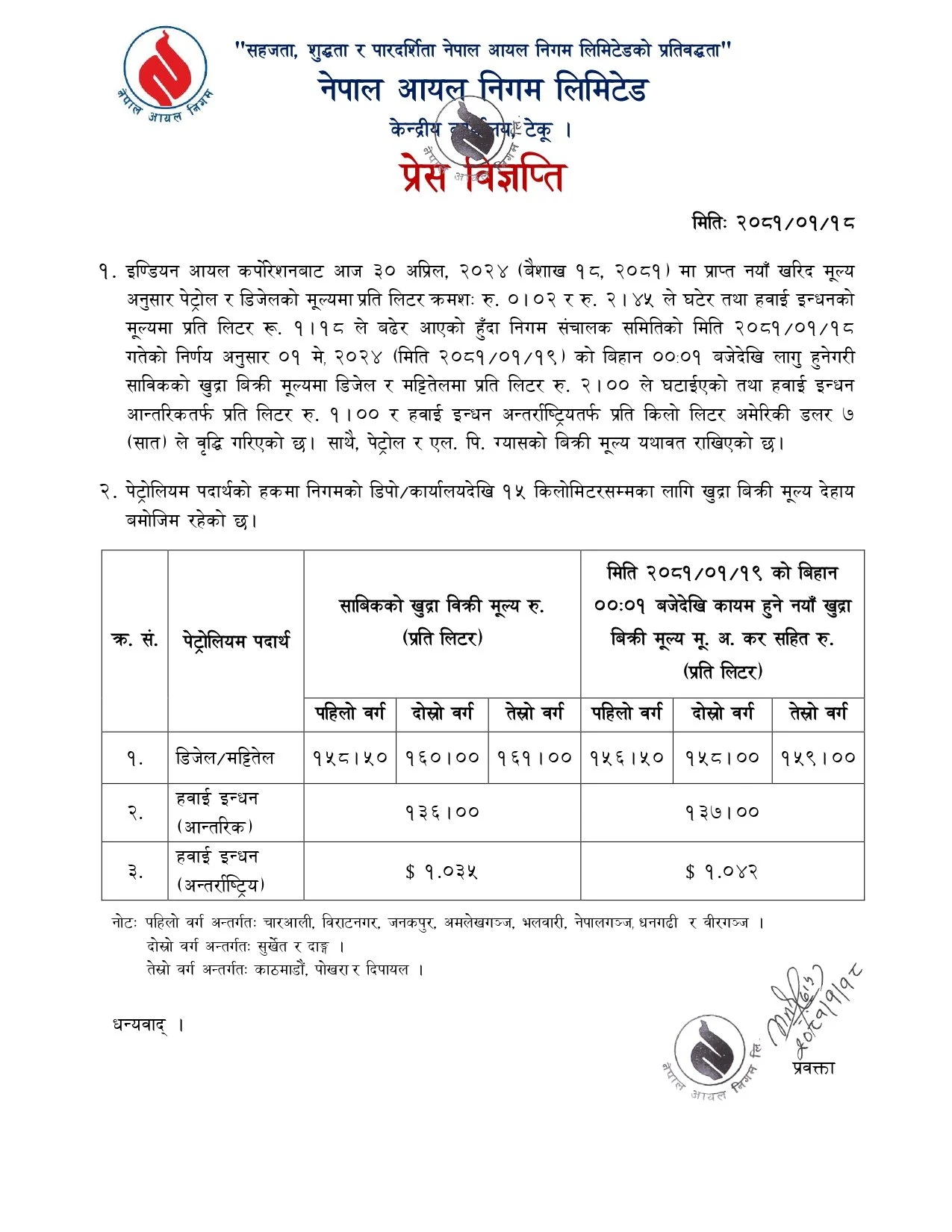 निगमका अनुसार आइओसीले पेट्रोलमा प्रतिलिटर ०.०२ रूपैयाँ र डिजेलमा २ रूपैयाँ ४५ पैसा घटाएर नयाँ मूल्य सूची पठाएको छ। त्यस्तै हवाइ इन्धन आन्तरिकतर्फ लिटरमा एक रूपैयाँ र बाह्यतर्फ प्रतिकिलोलिटर अमेरिकी डलर ७ बढाएर पठाएको छ।