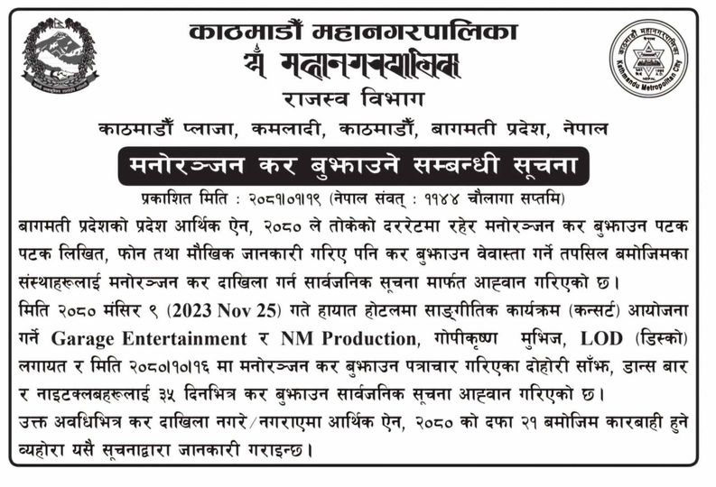 जारी गरेको सूचनामा ग्यारेज इन्टरटेन्मेन्टले २०८० मंसिर ९ गतेमा होटल हायातमा सांगीतिक कन्सर्ट गरेको उल्लेख छ । महानगरले यसअघि २०८० फागुन १६ गते रात्रिकालीन क्बल, डान्सबार, दोहोरी साँझलाई कर तिर्न पत्राचार गरेको थियो ।