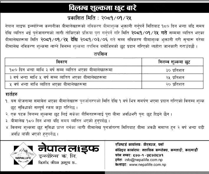 नेपाल लाइफको विलम्ब शुल्कमा ३०% सम्म छुट